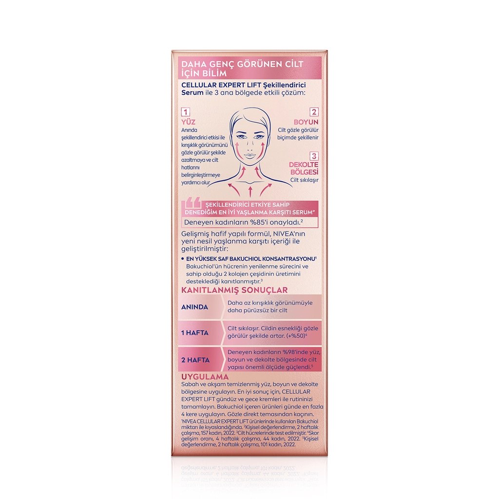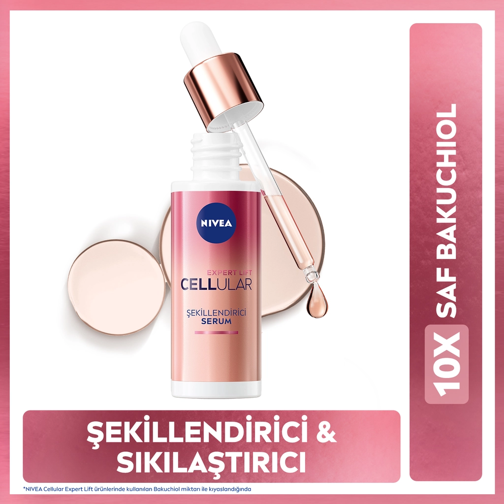 110 yılı aşkın cilt bakım uzman NIVEA'dan NIVEA Cellular Expert Lift Şekillendirici Serum 30 ml, anında daha az kırışıklık görünümüyle daha pürüzsüz bir cilt sağlar. 1 haftada cilt sıkılaşır, cildin esnekliği gözle görülür şekilde artar.