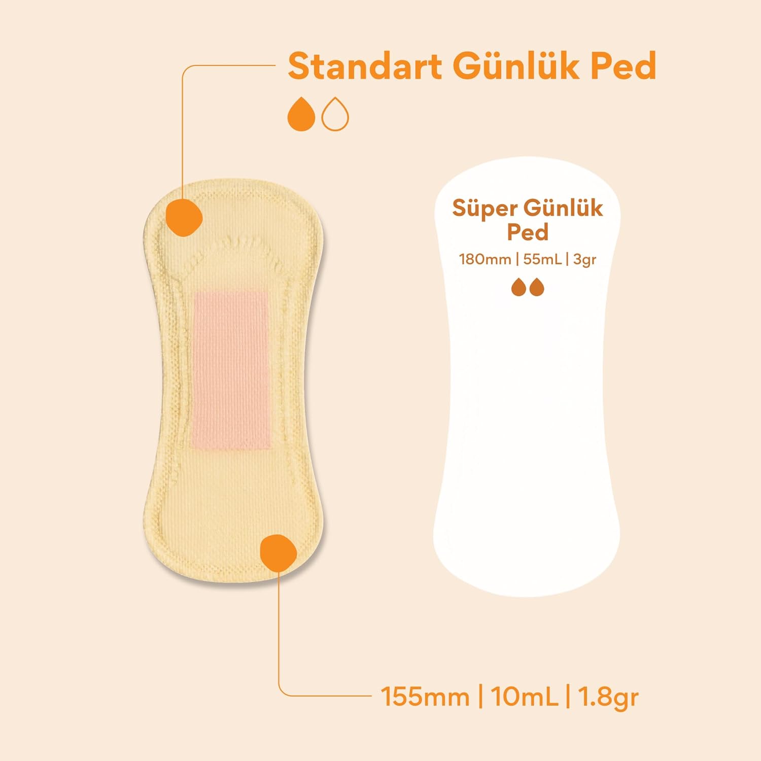 Beıje Günlük Standart Ped, 1.8 gr ağırlığıyla hafif ve rahat kullanım sunar. Standart emici yapısı nemi hızla hapseder, cildi kuru tutar ve tahriş riskini azaltır. İnce ve yumuşak üst yüzeyi konfor sağlarken, alt yüzeyi pedin yerinde sabit kalmasına yardımcı olur. Günlük hijyen ve güvenlik için uygundur.