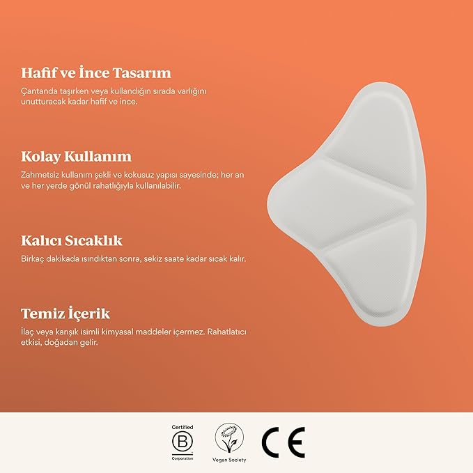 İlaç içermeyen, kokusuz, vegan, esnek ve ince yapısıyla son derece kolay kullanılan ısı bantları. 8 saate kadar sıcak kalarak, kontrollü ve devamlı ısı salınımı ile temas ettiği bölgedeki kasları rahatlatır ve kan dolaşımını düzenler. Bu sayede kramp ve ağrıları hafifletmeye destek olur.