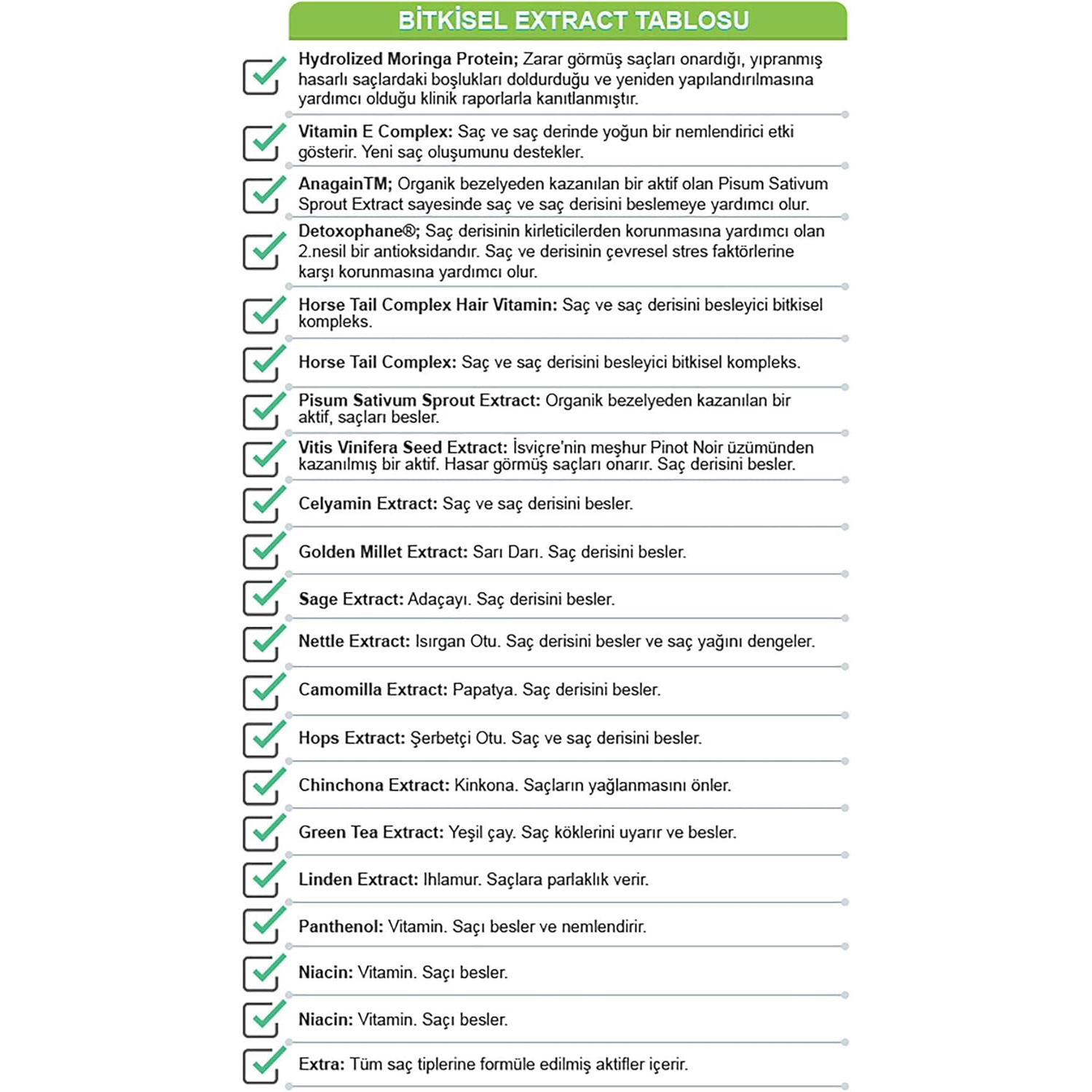 BİTKİSEL AJANLAR KULLANILARAK SAÇLARI DAHA SAĞLIKLI VE DAHA GÜÇLÜ HALE GETİREREK SAÇ KAYIPLARINI ENGELLEMEK İÇİN ÜRETİLMİŞTİR.